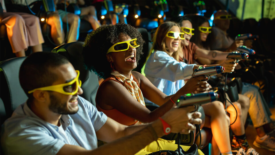 EtherQuest seamlessly transitions guests from passive observation to active participation. The attraction includes an interactive shooting element where guests utilize custom devices to defeat the nefarious protagonists who attack from all sides. Raytracing was utilized in the system, ensuring that when guests shoot, the environment is physically altered based on where they aim. Additionally, a 4.1 sound system was incorporated, so the audio originates from both the source and depth of the guests’ interactions.