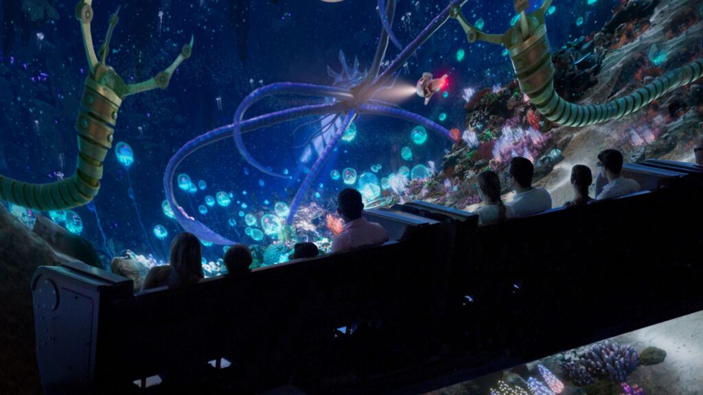 Just as the seats settle into their new position, high above the floor, the Nylobyss extends its tentacles through a portal, yanking the tour group directly into Azurlan. Guests are now getting their first look at the brilliant underwater realm that Kilgore spoke so highly of just moments before. Unfortunately, the kraken-like creature that’s now in the dead center of the screen is bent on ruining the mood. The battle is on!